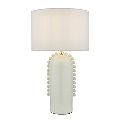 The ultra-trendy Dolce Ceramic Table Lamp has a line of hand-applied bobbles along its silhouette finished in a glossy ivory glaze with polished gold details and a white cotton shade. Fitted with a white cable and inline rocker switch for ease of use.