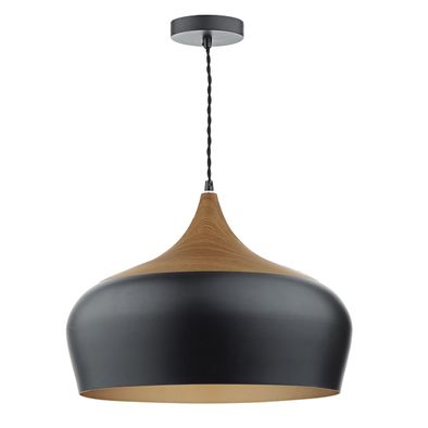 The GAUCHO 1lt Large Pendant features a matt black ceiling plate and shade with feature wood effect cap detail. and matt copper interior giving a warm glow of light.